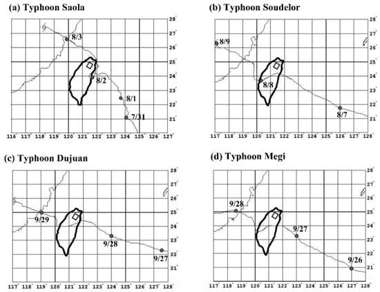 Typhoon center tracks: (a) Typhoon Saola in 2012, (b) Typhoon Soudelor in 2015, (c) Typhoon Dujuan in 2015, and (d) Typhoon Megi in 2016.
