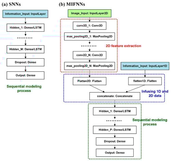 Model architectures for (a) sequential neural networks (SNNs) and (b) multiple-input functional neural networks (MIFNNs).