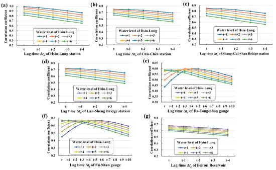 Correlation coefficient between water level with lead times of Hsiu-Lung station and various attributes with lag times: (a) Hsiu-Lung station, (b) Chu-Chih station, (c) Shang-Gui-Shan Bridge station, (d) Lan-Sheng Bridge station, (e) Da-Tong-Shan gauge, (f) Fu-Shan gauge, and (g) Feitsui Reservoir.