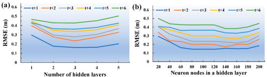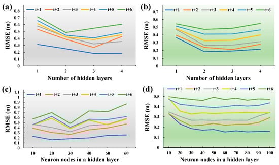 Hyperparameters were calibrated for MIFNN models, comprising the number of hidden layers and of neuron nodes in a hidden layer. In Figure 8, the testing typhoon, Saola, was used as an example. The optimal lengths of the hidden layers were 3, and the optimal number of nodes in a hidden layer was in the range of 120–160 nodes.