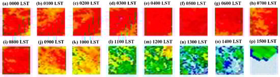 Typhoon Soudelor: cropped images at 8 August 2015 from 0000 LST to 1500 LST at 1 h sampling frequency: (a) 0000 LST, (b) 0100 LST, (c) 0200 LST, (d) 0300 LST, (e) 0400 LST, (f) 0500 LST, (g) 0600 LST, (h) 0700 LST, (i) 0800 LST, (j) 0900 LST, (k) 1000 LST, (l) 1100 LST, (m) 1200 LST, (n) 1300 LST, (o) 1400 LST, (p) 1500 LST.