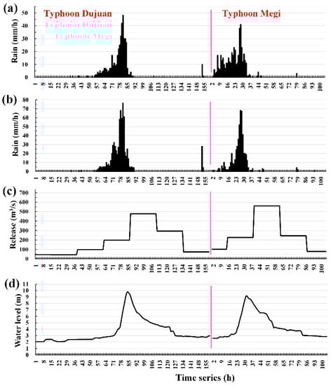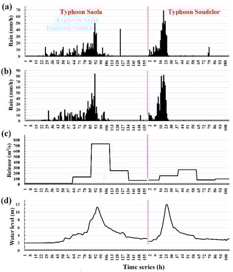 Figure 9 and Figure 10 show that the peak water level of the Hsiu-Lung station is contributed primarily by upstream rainfall (because the peak water level at the Hsiu-Lung station occurred after maximum rainfall) and secondarily by reservoir release (because the maximum water discharge times of the four tested typhoons all occurred after the water level peaked at the Hsiu-Lung station). This study further confirmed that, for the four testing typhoons, the difference between the maximum precipitation time and the peak water level time at the Hsiu-Lung station (i.e., the lag time) was minimal (between 3 and 4 h). Furthermore, this study discovered that, for the four testing typhoons, the maximum precipitation values estimated at the Da-Tong-Shan gauge and the Fu-Shan gauge differed greatly. The results were as follows: the maximum rainfall values at the Da-Tong-Shan gauge and the Fu-Shan gauge were (50, 84 mm/h) for Typhoon Saola, (69, 82 mm/h) for Typhoon Soudelor, (48, 76 mm/h) for Typhoon Dujuan, and (41, 68 mm/h) for Typhoon Megi. Accordingly, the spatial distribution of rainfall within the catchment area varied considerably.