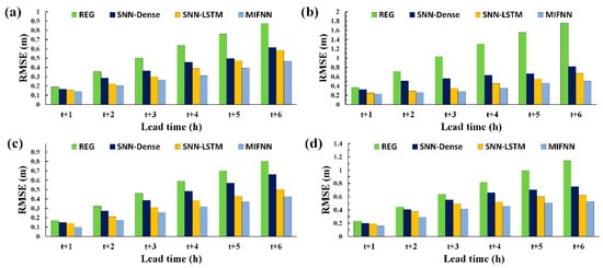 Figure 11 (typhoons Saola and Soudelor) and Figure 12 (typhoons Dujuan and Megi) depict the water level time series graphs of observations and the predictions of the proposed models. The thick gray solid lines (observation) represent the observed water levels of the Hsin-Lung station, and the remaining four lines are the forecasting results of the REG, SNN-Dense, SNN-LSTM, and MIFNN models. As seen in Figure 11 and Figure 12, when lead time = 1 h, no major deviations were visible between the predicted results and the observed values. However, when the forecasting horizons were longer, the differences between the models’ overall forecast performance, actual peak water levels, and arrival times increased.