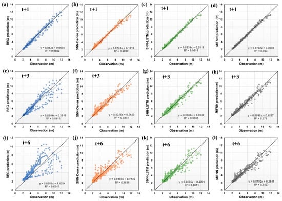 Observations versus predictions using REG, SNN-Dense, SNN-LSTM, and multiple-input functional neural networks (MIFNN) models for lead times of 1 h (a–d), 3 h (e–h), and 6 h (i–l).