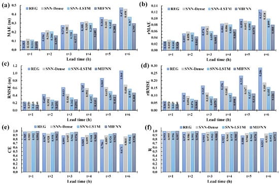 In Figure 15, model performance is compared within a lead time of 1–6 h. Figure 15a–d reveals that in terms of the MAE, rMAE, RMSE, and rRMSE indicators, the MIFNN model outperformed the REG, SNN-Dense, and SNN-LSTM models. In the deviation comparison, the SNN-LSTM model was inferior to the MIFNN model but superior to the REG and SNN-Dense models; the REG model outperformed the SNN-Dense model only when the lead time was 1–4 h, yet its remaining deviation indicators were all higher than those of other models. The ordering of the performance in terms of CE (Figure 15e), according to the scores obtained by the four models, is as follows, in descending order: the MIFNN model (with a CE range of 0.994–0.936 for 1–6 h lead time), the SNN-LSTM model (CE = 0.992–0.904), SNN-Dense model (CE = 0.989–0.864), and the REG model (CE = 0.985–0.671). In addition, according to the R results (Figure 15f), the MIFNN and REG models, respectively, yielded the best and worst performance.