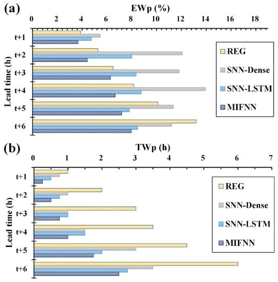 Comparisons of peak water level performance for (a) percentage of peak water levels (EWp) and (b) time error of peak water levels (TWp).