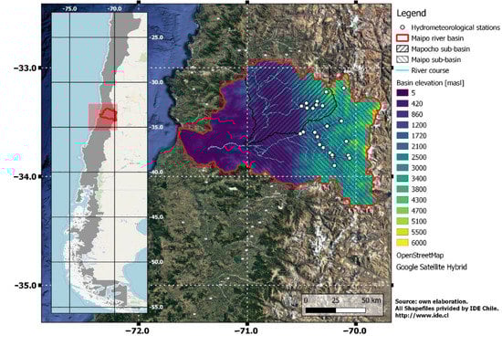 The Maipo River basin in central Chile (~33°S, ~70°W), is defined by a strong Mediterranean climate and nival regime, characterized by wet and cold winters and dry hot summers. The Maipo Basin is bounded north by the Aconcagua basin, south by the Cachapoal, east by the Andes and west by the Pacific Ocean. Water flows East to West, beginning in the Andes at 6570 meters above mean sea level (m.a.m.s.l.) and ends in the Pacific Ocean, 250 km away. Like other rivers in the area, the Maipo and its tributaries are short with steep slopes. Maximum precipitation occurs between July and September, with average annual precipitation close to 290 mm [69]. Precipitation amounts are, in general, larger towards south and east. The basin is about 15 thousand square kilometers and is comprised of two main tributaries, the Maipo and the Mapocho Rivers (Figure 1). The Mapocho sub-basin is considerably smaller and with lower attitude (2370 m.a.m.s.l.) than the Maipo sub-basin. The Mapocho sub-basin has less area above the ZDI and therefore less winter snow accumulation. Its fluctuations mostly depend on snowmelt, peak river flow tends to be earlier in spring with a maximum in November, and the extreme low-water flow occurs in the autumn months [63]. This highlights the contrast of nival influence between the sub-basins.