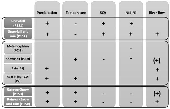 In Figure 3, the responses on Precipitation, Temperature, SCA, NIR-SR, and River flow are matched for events of snowfall, rain, rain-on-snow, and combinations of events. Plus (+) and minus (−) signs indicate if an increase or decrease is expected from an event (parentheses are used when the response is not certain). Empty cells suggest no response is expected. In snowfall events, precipitation is accompanied by a decrease in temperature, increase in SCA and NIR-SR. Rain events are expected to be matched with a response in river flow. Rain-on-snow events would most likely be related to increases in temperature and reduced SCA and NIR-SR.