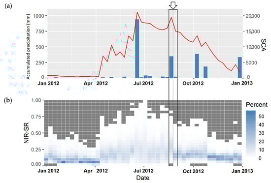 An example of the analysis done with (a) SCA (red line), (b) NIR-SR (heatmap) and precipitation events (blue bars) for the Maipo basin in the year 2012.