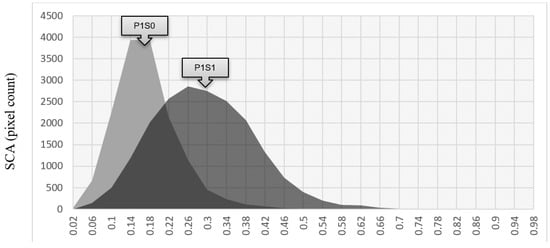 The first event, classified as P1S1, is displayed in Figure 5 in a darker color. The second event is displayed in a lighter color and corresponds to the next timestep. The first event displays a normal-looking distribution of NIR-SR ranging between 20% and 40% reflectance, with a symmetric unimodal curve (skew and kurtosis close to zero). The second event is much more skewed, ranging between 10% and 30% reflectance, it has both lower mean and variance. Along with a reduction in SCA, the second event (displayed as P1S0) shows significant changes in the snowpack during a small window of time. These changes are very inconsistent with a snowfall but highly suggestive of ROS.