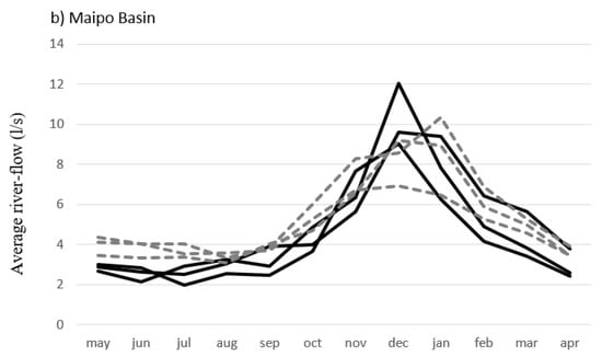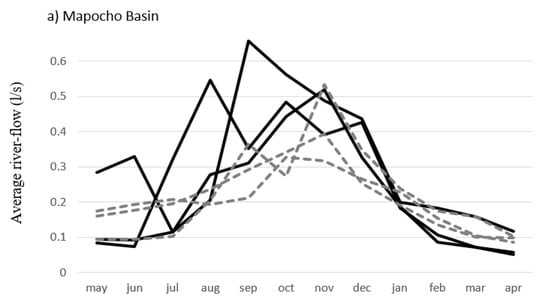 Average river-flow for high (solid lines) and low occurrence (dotted lines) of rain-on-snow event, for the Maipo (a) and Mapocho (b) sub-basins.