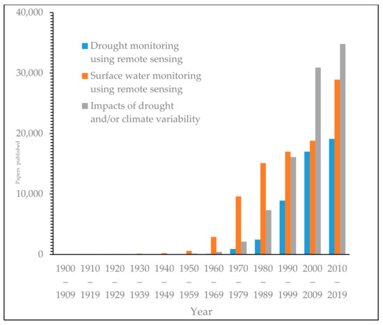 Overall, the literature showed that the use of remote sensing for drought and surface water body monitoring has increased significantly in recent years. However, remote sensing applications have not diversified, as there are still many gaps in research, suggesting that its applicability has not been fully tested or exploited for monitoring purposes. Furthermore, not enough studies have been conducted using remote sensing for drought and surface water body monitoring, with approximately only 18,000 articles regarding drought monitoring using remote sensing published from 2010 to 2019 (Figure 1). This observation implies that remote sensing needs to be harnessed to further advance its scientific contribution in various application areas including, but not limited to, drought monitoring, surface water body monitoring, and climate variability, especially in Africa.