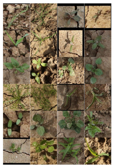 Some crop and weed images that were used for the training of the network. (a,b) Alopecurus myosuroides, (c,d) Amaranthus retroflexus, (e,f) Avena fatua, (g,h) Chenopodium album, (i,j) Helianthus annuus, (k,l) Lamium purpureum, (m,n) Matricaria chamomila, (o,p) Setaria spp., (q,r) Solanum nigrum, (s,t) Solanum tuberosum, (u,v) Stellaria media, (w,x) Zea mays.