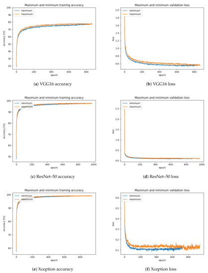 A loss function is used to improve and evolve the accuracy of a neural network model. Loss functions try to map the parameters of the network onto a single scalar value that indicates how well those parameters achieve in performing the task the network is intended to do. The loss value implies how poorly or well the model behaves after each iteration of optimization. In our case, the model loss is visualized via the sum of errors made for each example in the training or validation set, respectively. The training and validation loss reacted similarly in all networks with the validation loss presenting higher fluctuations and differences than the training loss. The validation loss decreases steadily until it reaches the lowest value depending on the neural network, in similar epochs like the maximum accuracy was achieved. For VGG 16 that was at around 300 to 700 epochs (Figure 4b), 350 to 850 epochs for ResNet–50 (Figure 4d), and 400 to 800 for Xception (Figure 4f). The highest fluctuations between the minimum and the maximum loss difference were monitored for the Xception neural network training while the lowest fluctuations were monitored at the ResNet–50 training.