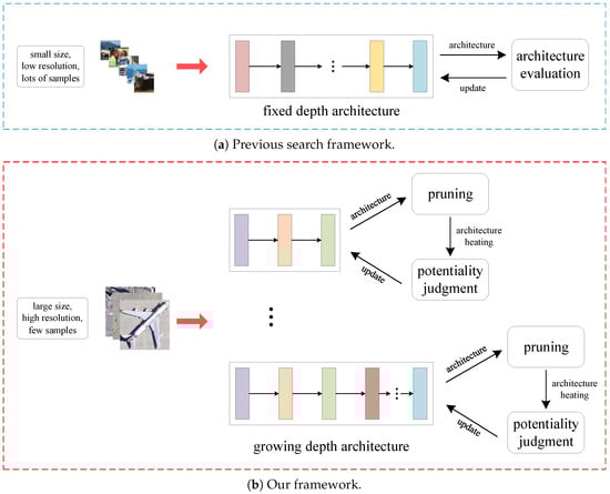 Recently, a novel framework named Neural Architecture Search (NAS) [18,19,20,21,22,23] is proposed to automatically design a neural network architecture. In NAS framework, complex architecture engineering can be greatly reduced. Hence, it has immediately attracted wide publicity and gradually becomes a research focus. An illustration of manual and automatic architecture design can be seen in Figure 1. In general, NAS can be divided into three classes according to the search strategy: Reinforcement Learning (RL) [18,19], Evolutionary Algorithm (EA) [20,21] and Gradient-Based method [22,23]. RL strategy takes a Long Short Term Memory (LSTM) [24] controller as an agent which can sample a network architecture in predefined search space by a certain probability. After that, the network is trained and the performance of it services as reward to optimize the controller by leveraging Policy Gradient. As for EA approach, a neural network architecture is regarded as a genotype. The optimization process is similar to natural selection in Biology field. Genotypes with poor performance are eliminated immediately while that performing well are retained. And then crossover and mutation are conducted among them. Different from RL and EA which both adopt discrete optimization procedure, Gradient-Based method utilizes a novel relaxation programme to transform search space to be continuous. By means of this technique, architecture search process can become differentiable and gradient descent algorithm is able to be applied in it. Moreover, the computational consumption is relatively low compared with the former two search strategies. For these reasons, Gradient-Based method is becoming widely popular.
