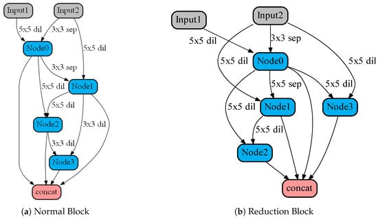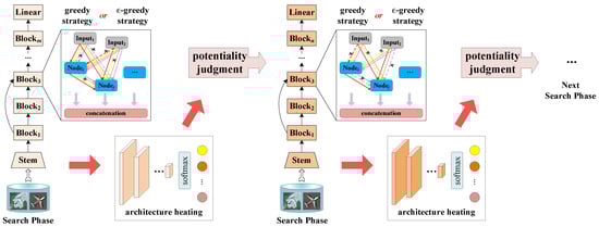 where represents the optimal weight parameter which is able to minimize the training loss. Through the alternate optimization, the best architecture parameter and weight parameter can be obtained. Then the entire neural network can be constructed by decoding the best architecture parameter . Next, the network can be trained from scratch as common measures [9,10].