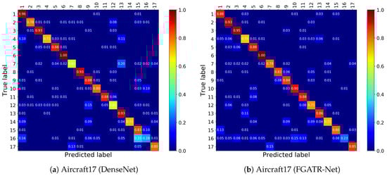 From the confusion matrix results in Figure 10, we observe that most types of aircrafts can be correctly distinguished on Aircraft17 dataset. The recognition metrics of them are satisfied in principle, especially for type 6 whose accuracy even reaches 100%. Nevertheless, the proposed method can still get some further improvements. We notice that the recognition performance of type 16 is a huge drag on OA metric for the best baseline model (i.e., DenseNet) and the proposed FGATR-Net. In DenseNet model, type 16 is most likely to be identified into type 15 while FGATR-Net possibly recognizes this type as type 10 and type 11.