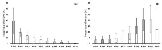 Density metrics of (a) shrub–tree plots and (b) tree–shrub plots. An airborne laser scanning data from each plot was divided into 10 height slices from low to high (RS01–10) and the proportion of returns in each slice is the corresponding density metric.
