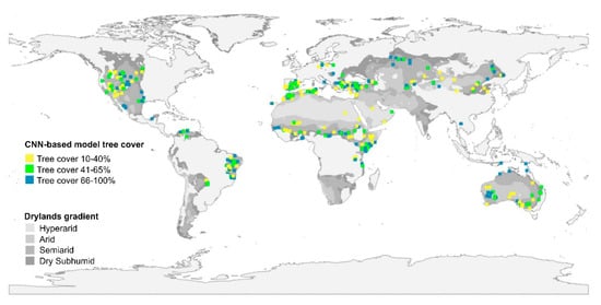 - Classification phase: classification of new 396 images with different tree cover in global drylands (see Supplementary Material, Table S1 and Archive S3) with the built CNN-based model (see Section 2.4).