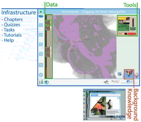 Annotated screenshot of the module “Floods—Dealing with a constant thread”. All data and the necessary tools are integrated in the learning environment. Background knowledge is made available through an info box. The infrastructure is a combination of methods by which to structure the whole learning module (Source: see Appendix B).
