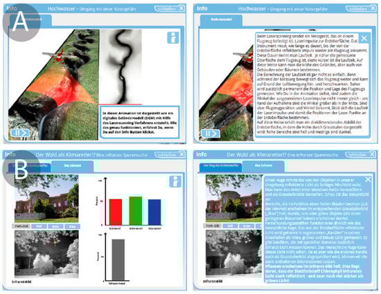The “Multiple Representations Principle” in action. (A) shows a screenshot of the learning environment “Floods” with an interaction about the creation of a digital terrain model. Text and interaction complement each other. (B) shows an example of the module “Forests—A Climate Saver?” where an interactive component alongside a text explains how infrared is depicted in an image (Source: see Appendix B).