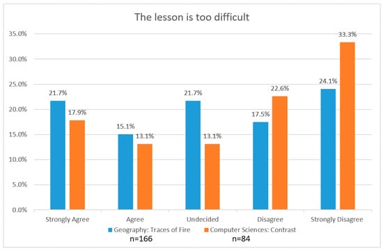 However, pupils’ opinions on how difficult the lessons were differed depending on the learning module. This can be observed in Figure 6. While the pupil’s evaluations of the difficulty level for the lesson “Computer Science: Contrast” were pretty much in line with the general perception of the difficulty throughout the learning modules, it varied substantially in the lesson “Geography: Traces of Fire”. One possible reason for this is the slightly different application of animation interactions.