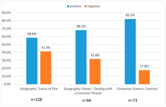 Pupils reacting positively (agreeing strongly or agreeing) or negatively (disagreeing or disagreeing strongly) to the statement “The illustrations and animations are helpful for completing the tasks” in different learning modules.