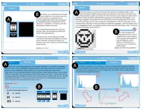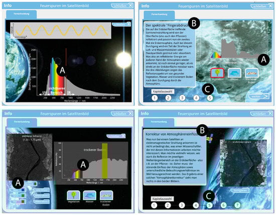 Figure 8 shows that the pupils’ evaluations differed depending on the learning module that was used. While the majority always found the animations and illustrations useful, this was a lot more apparent in the lesson “Computer Science: Contrast”, for example. Here a 1/0.2 ratio can be found for every pupil that agreed or agreed strongly, as opposed to pupils who disagreed or disagreed strongly. Looking for the characteristics that set these animations and interactions apart from those in “Geography: Traces of Fire”, where the ratio was just 1/0.7, the most striking is the length and amount of information that they tried to convey, i.e., substantially more in the latter, where the interactive animations themselves stretched over several chapters. This is an intentional attempt at breaking down the information into small bits and thereby complying with the design paradigm of coherence (see Section 2.3). But because the absolute amount of information was not reduced in the same manner, this may have reduced the efficiency of the interactions. Figure 9 shows screenshots from the biology lesson, where the added value of animations and interactions was evaluated more critically. The background information given in the first chapter of the module is in itself a short introduction to basic principles of remote sensing. It is plainly visible that the multiple representation principle was applied consistently, as every explanation in text form (A) was accompanied by illustrations, animations, or interactions (B). Notice the chapter indicator (C) showing that this background information in the module consists of seven chapters, which comprise additional subsequences of only the first of four chapters of the whole ILE. So, there is a lot of information to be absorbed by the pupils who are already exposed to a topic they most likely never heard of before. This information should have been more clearly reduced in both the didactic and quantitative sense to avoid unnecessary extraneous cognitive load. The interactive introduction to earth observation was later decoupled from the learning environment and used as a single resource to introduce teachers or students to remote sensing, where it was well received.