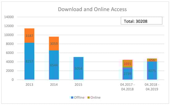 The learning platform has been online since 2012. An evaluation of the login data was conducted for the years 2013, 2014, 2015, as well as for the two-year time period from April 2017 to the end of March 2019. Technical issues, as well as the fact that the project was not funded throughout the whole eight years, prevented a more complete assessment of the data, and also explains the missing offline data for 2015. Figure 8 shows that in the four recorded years, the materials were downloaded or accessed online over 30,000 times. Considering the almost two missing years, in which the platform was online and accessed, this can be seen as an encouraging number that indicates that tens of thousands of pupils were brought into contact with earth observation. The figure also shows that access and download numbers were halved in those eight years. Part of the loss of users can be associated with fewer personnel that were involved in updating and advertising the learning portal on occasions like teacher trainings due to funding issues. But also, technical problems may have had a negative impact. A major issue is the dependency on Adobe Flash Player technology. While being the natural choice for complex web applications at the time in which the learning modules were conceptualized and created, today, most browsers discourage or even discontinue its use for security and other reasons, making it harder to use the online material, especially on Apple and Linux operating systems. In the period 2017–18, online access shrunk drastically, while the number of downloaded modules increased by almost two thirds. Since the downloaded modules can be used without the Flash Player on Windows systems, this can be seen as a clear indicator of the impact of the discontinued Flash support in browsers. Therefore, addressing that technical issue is the main task to ensure the continued use of the ILEs in the future.