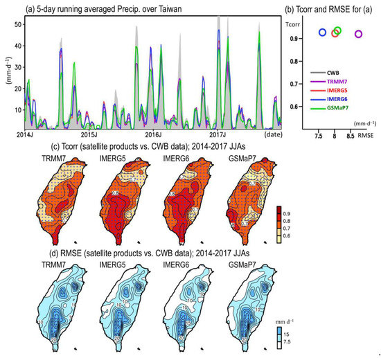 Figure 2a shows the time series of the 5-day running mean for the precipitation area-averaged over Taiwan during the summers of 2014–2017. Using the time series in Figure 2a, two statistical scores, Tcorr and RMSE, between the CWB data and the SPPs, were then calculated for providing evaluation evidence. As seen in Figure 2b, all SPPs have similar values of Tcorr (~0.9), but the lowest RMSE is observed in IMERG6 and the highest RMSE is observed in TRMM7. Overall, the RMSE of IMERG6 (~7.6 mm⋅d−1) is approximately 12.6% lower [= (8.7 − 7.6)/8.7 × 100%] than the RMSE of TRMM7 (~8.7 mm⋅d−1).