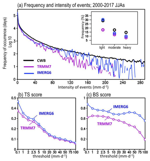 Next, statistical evidence is provided for evaluating the capabilities of IMERG6 and TRMM7 to depict the variations of daily precipitation events during the summers of 2000–2017. Figure 3a shows the distribution of the occurrence frequency of precipitation events at various ranges of intensity (units: mm⋅d−1). From Figure 3a, we note that both TRMM7 and IMERG6 tend to underestimate the occurrence frequency of precipitation events at most ranges of intensity. Despite that, the performance of IMERG6 is overall better (i.e., more close to the CWB data) than TRMM7, in particularly for capturing the occurrence frequency of light precipitation events (see right top panel of Figure 3a).