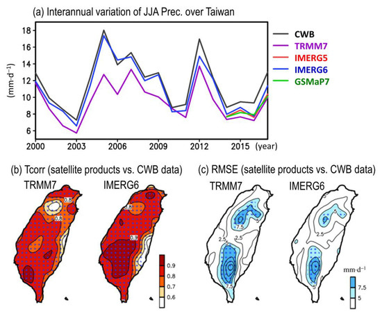 Also, for the performance of IMERG5 and GSMaP7 in illustrating the interannual variation of summer precipitation over Taiwan, some information is given in Figure 4a. It was found that even when focused on the summers of 2014–2017, IMERG6 (TRMM7) is still more (less) close to the CWB data, as compared to the other SPPs.