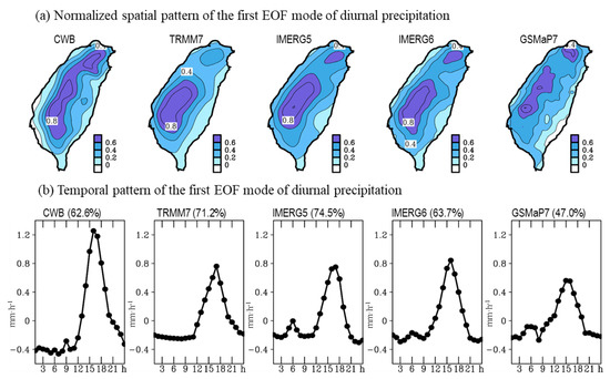- Spatially (Figure 5a), the first EOF mode of the CWB data shows two maximum centers: one in central-west Taiwan and the other in northern Taiwan. For the SPPs, all of them are able to show two maximum centers in Figure 5a. However, the locations of the maximum centers in GSMaP7 are apparently shifted to the west compared to the CWB data.