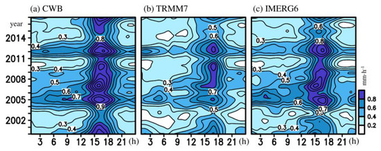 The performance of IMERG6 and TRMM7 in illustrating the variation of diurnal precipitation area-averaged over Taiwan during the summers of 2000–2017 was further evaluated based on Figure 6. The CWB data (Figure 6a) shows that all examined periods have maximum diurnal precipitation occurred between 15-18 h. By comparing Figure 6a with Figure 6b,c, we note that both TRMM7 and IMERG6 are able to show the temporal phase evolution similar to the CWB data, with the value of Scorr between Figure 6a and Figure 6b (Figure 6c) is about 0.91 (0.92). However, it is also apparent in Figure 6 that both TRMM7 and IMERG6 tend to underestimate the amplitude of diurnal precipitation for all examined time periods, but TRMM7 (IMERG6) is less (more) close to the CWB data. All above features revealed in Figure 6 are consistent with those suggested by Figure 5 and Table 2, suggesting again that IMERG6 is better than TRMM7 in depicting the variation of diurnal precipitation over Taiwan.