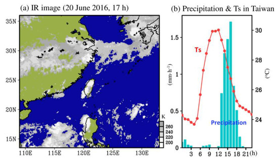 (a) Infrared cloud image, obtained from Gridded Satellite B1 Observations (https://www.ncdc.noaa.gov/gridsat/), for an example of convective afternoon rainfall (CAR) event that occurred on 20 June 2016, 17 h (local time) in Taiwan. (b) Time series of hourly precipitation (bars) and surface temperature (Ts, red line) averaged from local stations in Taiwan for the event shown in (a).