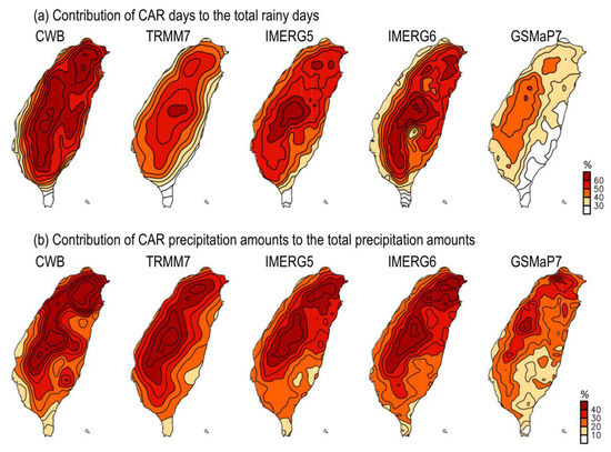 By separating the precipitation amount into the occurrence frequency and the intensity (i.e., precipitation amount = occurrence frequency × intensity), it is however noted from Figure 9b that both IMERG6 and TRMM7 tend to underestimate the contribution of CAR events to the occurrence frequency of total precipitation events, as compared to the CWB data. This might be because the SPPs, which utilize precipitation estimation from infrared and passive microwave sensors, are poor at retrieving local precipitation events over complex mountainous areas [42,48].