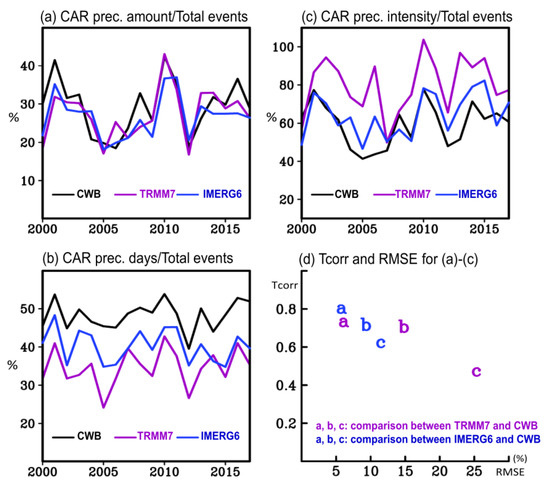 In contrast to Figure 9b, it can be noted in Figure 9c that both IMERG6 and TRMM7 tend to overestimate the contribution of CAR events to the intensity of total precipitation events. This might be because that satellite methods assume heavy precipitation results from deep clouds [42], and CAR events in Taiwan are belong to local deep convections [30]. Despite the bias seen in Figure 9b,c, we note from Figure 9d that IMERG6 (with higher Tcorr and lower RMSE) outperforms TRMM7 overall in illustrating the interannual variations of CAR activities. Therefore, we suggest that using IMERG6 to replace TRMM7 can benefit the researcher by obtaining more accurate characteristics of CAR in Taiwan.