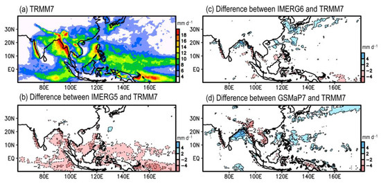 (a) Mean seasonal precipitation averaged during the summers of 2014–2017, estimated by TRMM7, over the Asian domain (60°E–180°, 10°S–40°N). (b) is related to (a), except for the difference between IMERG5 and TRMM7. (c) is similar to (b), except for the difference between IMERG6 and TRMM7. (d) is similar to (b), except for the difference between GSMaP7 and TRMM7.