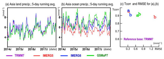 Consistent with Figure 10, IMERG5 also has the daily variations in oceanic precipitation area-averaged over the Asian domain, more different to TRMM7 (Figure 11b; 5 day running mean applied). In contrast, for the daily variations in land-averaged precipitation, GSMaP7 appears to differ the most from TRMM7 (Figure 11a; 5 day running mean applied). To support the above arguments, we further calculate Tcorr and RMSE based on the time series given in Figure 11a,b and show the results in Figure 11c. It is confirmed that: (1) GSMaP7 has a more clear difference to TRMM7 (i.e., smaller Tcorr and larger RMSE) over the land; and (2) IMERG5 has a more clear difference to TRMM7 over the ocean. This information is particularly important for studies that tend to use GPM products to replace TRMM7 for estimating the moisture budget over the Asian domain [49,50,51,52].