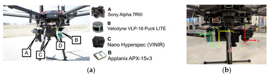 The unmanned aerial vehicle (UAV)-based mobile mapping system used in this study: (a) the sensors mounted on the UAV and (b) the orientation of the global navigation satellite system/inertial navigation system (GNSS/INS) body frame (yellow), laser unit frame (green), and RGB camera frame (red) coordinate systems.