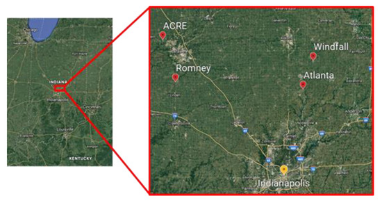 Location of the surveyed agricultural fields: Purdue’s Agronomy Center for Research and Education (ACRE) (including ACRE-42 and ACRE-21C), Romney, Windfall, and Atlanta, including two fields, Atlanta-1 and Atlanta-2.