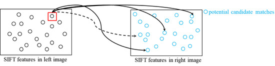 The first and foremost processing step in SfM is the identification of features in individual images. Extracted features are then matched in overlapping images. The most popular strategy follows a detect-and-describe framework that identifies a set of interest points, and generates descriptors based on local regions around the extracted interest points. Traditional feature detector and descriptor approaches—such as features from accelerated segment test (FAST) [37], SIFT [25], and SURF [26]—have been thoroughly evaluated [38,39,40]. Recently, with the rapid development of deep learning strategies, various convolutional neural network-based approaches are proposed to conduct interest point detection and descriptor learning [41,42,43]. Among the above-mentioned approaches, SIFT is still the most widely-used feature detection and characterization algorithm since it is invariant against several factors, such as scaling, rotation, and illumination changes. Recently, graphics processing units (GPUs) have been adopted in the implementation of SIFT-based algorithms [44,45] to improve the computational efficiency. The original implementation of the SIFT algorithm extracts a large collection of features and generates 128-dimensional feature descriptors. Then, for a given feature, , extracted in the left image, its conjugate feature in the right image is identified in three steps: (1) the L2 distances between descriptors of and all candidate features in the right image are computed, (2) if the ratio between the closest and second closest distances is smaller than a given threshold (e.g., 0.8), the feature with closest distance, , is accepted as a conjugate feature, and (3) steps 1 and 2 are used to identify the conjugate feature for from potential matching features in the left image, wherein the pair is considered to be valid if left-to-right and right-to-left matchings are consistent.
