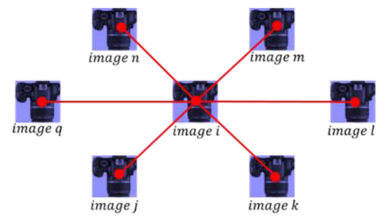 The implemented bundle adjustment procedure in this phase consists of three steps: feature tracking, 3D similarity transformation, and GNSS/INS-assisted bundle adjustment. More specifically, in the first step, SIFT matches that survived the prior steps of (1) left-to-right and right-to-left descriptor-based matching, (2) ROP estimation while removing matching outliers by imposing x-parallax and y-parallax constraints, and (3) translation averaging process while removing points with large back-projection errors, are tracked among all the involved imagery. The feature tracking process is based on a sub-graph structure, as shown in Figure 11, where the involved images are modeled as the nodes, and the estimated relative orientation parameters between the stereo-pairs represent the edges connecting different nodes. More specifically, given a point in image , its corresponding points are first identified within the sub-graph of image through an exhaustive search of the derived feature correspondences in possible stereo-pairs involving image . Then, the same procedure is sequentially conducted on every corresponding point that is identified in any of the overlapping images, i.e., images , , , , , and in Figure 11. This feature tracking process for point is repeated until no more corresponding points can be identified. In this research, an image feature has to be visible in at least three images to be considered further. Once all the SIFT features are tracked among all images, a multi light-ray intersection procedure is applied to derive the 3D coordinates of conjugate points. The outcome of this phase of data processing is a sparse point cloud, whose density depends on the feature detector and matching strategies. The coordinates of this point cloud are defined relative to the reference frame associated with the EOPs of the involved images. Before conducting bundle adjustment, a 3D similarity transformation must first be adopted to map the local frame-based EOPs to trajectory-based EOPs. Then, using the estimated transformation parameters, the sparse point cloud coordinates are transformed from the local reference frame to the trajectory-based mapping frame.