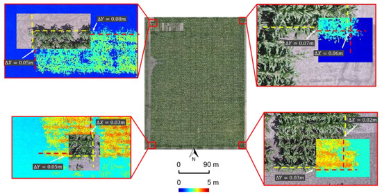As mentioned earlier, system calibration is a key step towards achieving accurately georeferenced products from GNSS/INS-assisted mobile mapping systems. In this research, the mounting parameters, defined by the boresight angles and lever arm components, between the GNSS/INS unit and other onboard sensors (i.e., LiDAR and RGB/hyperspectral cameras) are rigorously determined using the calibration strategy introduced in References [28,29]. In this strategy, the mounting parameters are simultaneously estimated through minimizing the discrepancies among linear/planar features and conjugate points extracted from LiDAR point clouds and images from different flight lines. Also, similar to the approach proposed in Reference [31], a time offset calibration is done to solve and correct for any possible time delay between the actual camera exposure and recorded event marker by the GNSS/INS unit. This approach modifies the collinearity equations so that the time delay can be directly estimated in the bundle adjustment process. The positional accuracy of the image/LiDAR-based products using this as well as similar systems have been extensively investigated through several studies [29,33,72,73].