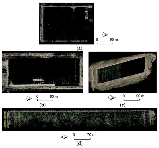 RGB color coded point clouds from Pix4D-2 results for (a) Romney, (b) Atlanta-1, (c) Atlanta-2, and (d) Windfall.