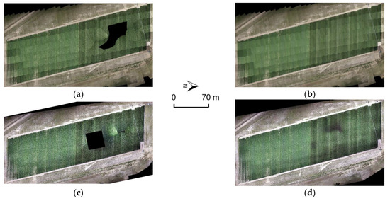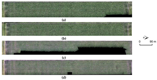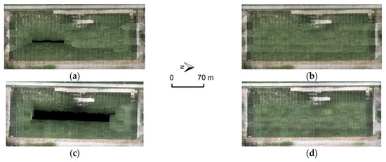 Romney orthophotos generated through (a) traditional SfM, (b) fully GNSS/INS-assisted SfM, (c) Pix4D-1, and (d) Pix4D-2.