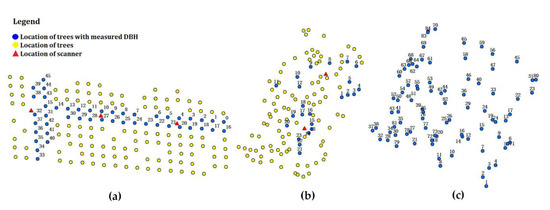 To evaluate the accuracy of the DBH estimation, the true DBHs of some trees were measured by the diameter ruler, which are shown in the Figure 2. There are 45 trees in the Gongan, 23 trees in the Wuhan, and 77 trees in the Finnish plot, with true DBHs analyzed to evaluate the accuracy of DBH estimation.