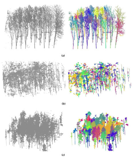 For plot Finland and plot Wuhan, we used the label connected components algorithm that has been integrated into Cloud Compare to find the connected components within organized point cloud data. When the octree level equals 10, trunks, shrubs, and weeds show better separability and the amount of data increased substantially when the octree level is bigger than 10 [40]. We used a 3D grid to extract the connected components. This grid was deduced from the octree structure, and the octree level was set to 10. As can be seen from the Figure 5, the non-ground point cloud can be divided into individual trees’ point clouds after segmentation.
