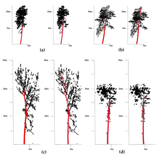 Extraction of the individual tree and stem were performed on all trees on three plots. Some representative extraction results were selected to reflect our algorithm and the stem extraction results of the two methods for stem extraction, which is shown in Figure 6. The left figure is the piecewise RANSAC cylinder fitting method, and the right figure is our improved algorithm. The black points in the figure are the tree points, and the red points are the extracted stem points. As shown in Figure 6a,b, the stem extraction results of two typical trees in plot Finland by the two methods were compared to show the improvement. As shown in Figure 6c,d, the stem extraction results of two randomly selected trees in plots Gongan and Wuhan by the two methods were compared.