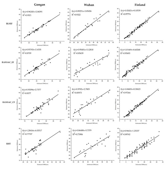 Figure 7 shows the scatter plot of TLS-estimated DBH and field-measured DBH in three plots. From the graph, the goodness-of-fit of the RLSEF method is the highest. The R-squared of this method is also the highest of the four methods. The results show that the RLSEF method produces lower mean errors for the three plots than with the other three algorithms.
